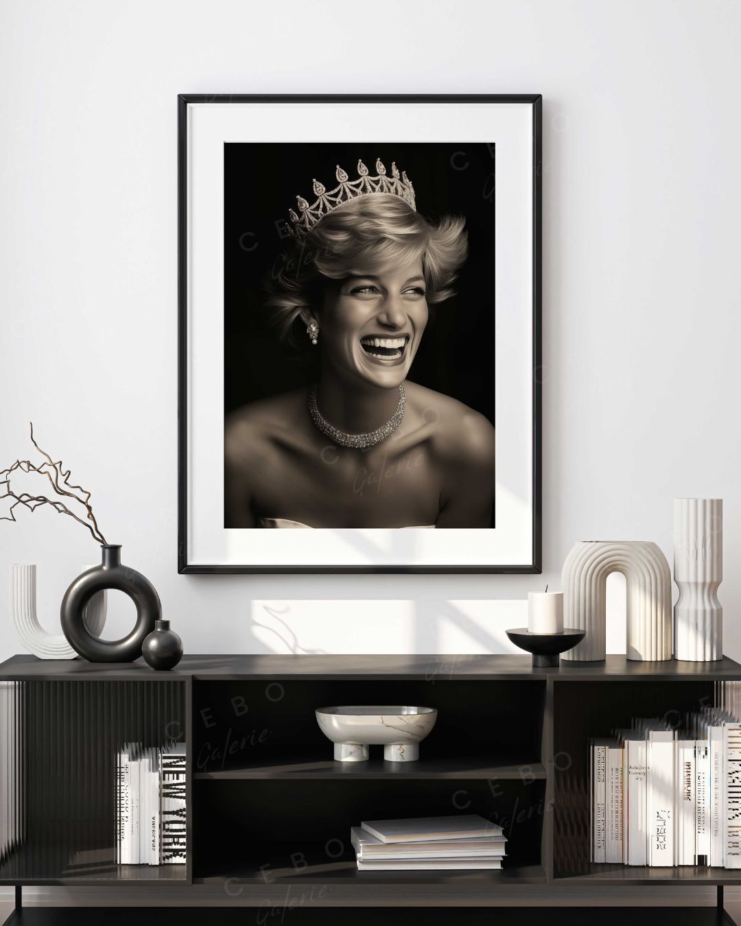 Cadre “Éclat de Diana”, “Éclat de Diana” est une affiche d’art encadrée d’une intensité rare, capturant la Princesse Diana dans un moment de joie pure et authentique. Dans cette œuvre conceptuelle en noir et blanc, son rire lumineux, sublimé par une couronne étincelante et des bijoux en diamant, irradie toute la composition. Une scène spontanée, sincère, qui révèle toute la grâce, l’humanité et la liberté de celle que le monde appelait “la princesse des cœurs”.