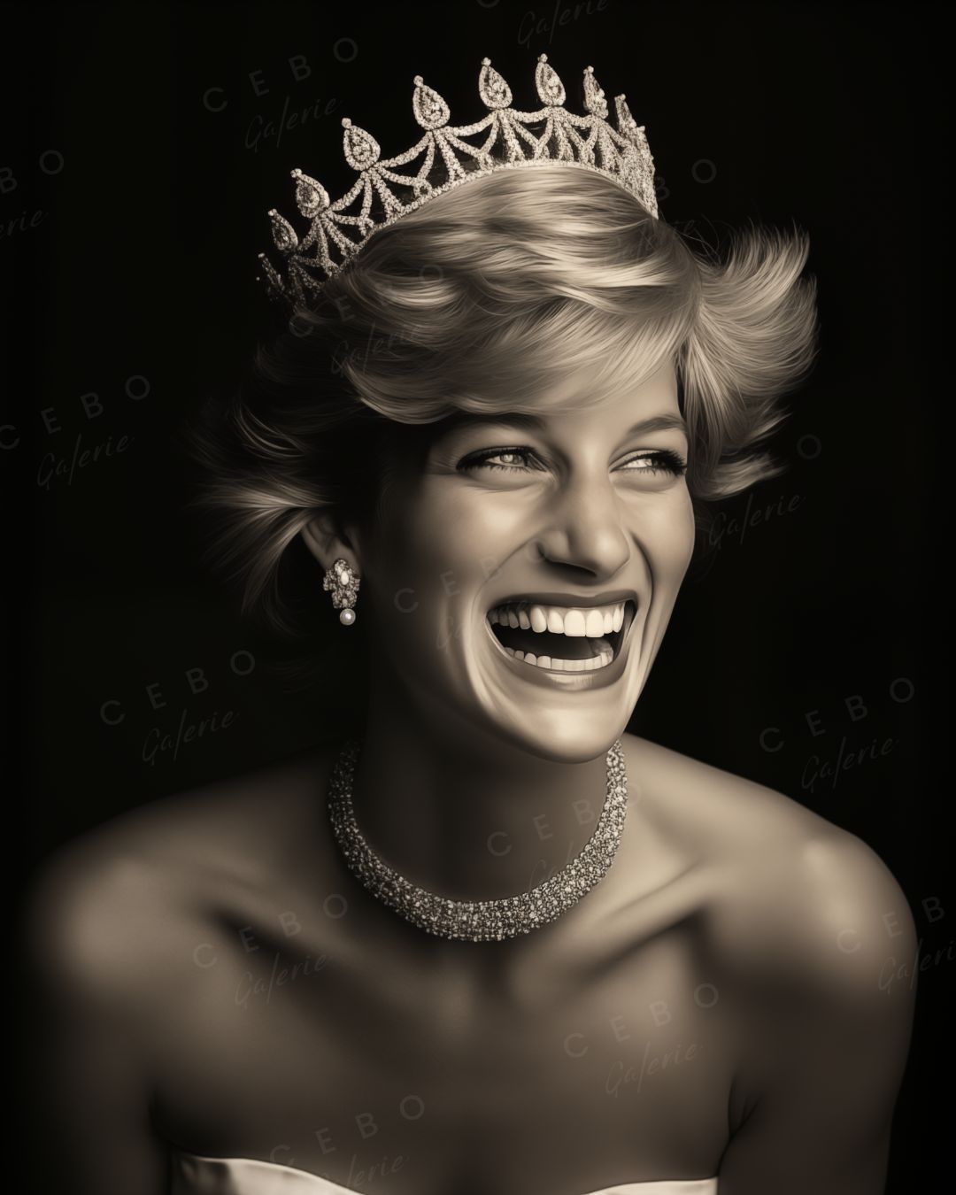Le fond noir profond accentue la puissance émotionnelle du portrait : il renforce les contrastes, intensifie l’éclat de son sourire et met en valeur la dimension intemporelle de cette figure légendaire. Ce jeu d’ombres et de lumière souligne l’héritage de Diana — entre noblesse et simplicité, force intérieure et douceur infinie.