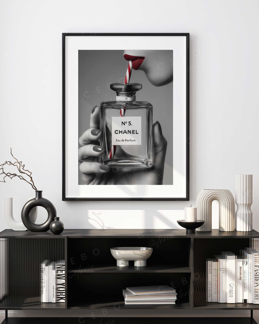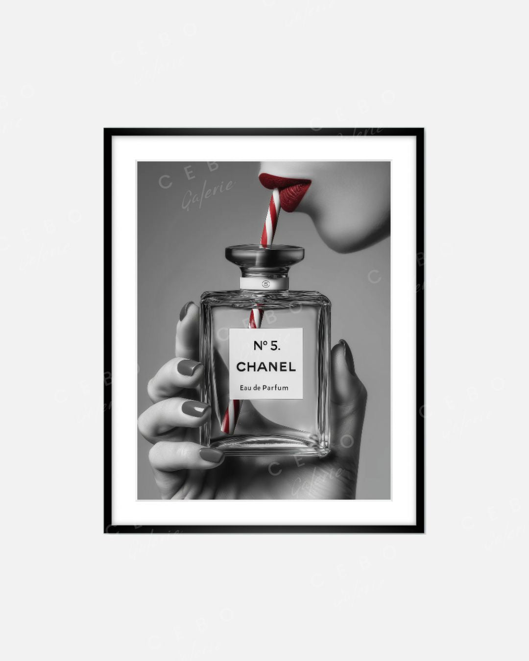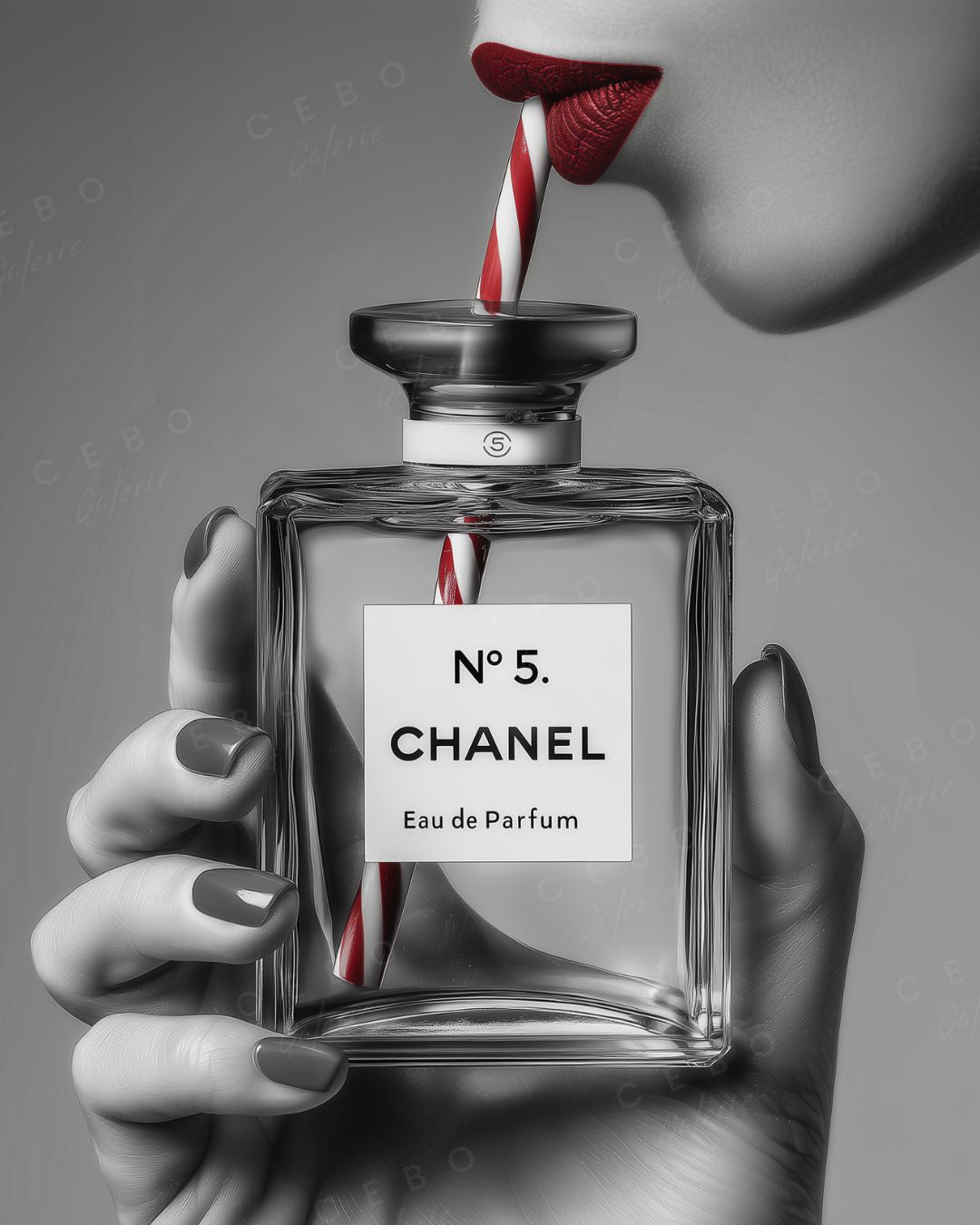 Sur un fond noir et blanc d’une élégance minimaliste, une main féminine saisit le mythique flacon Chanel, transformé ici en objet de désir décalé : une paille rayée rouge et blanche relie le parfum aux lèvres carmin sensuelles, détournant avec humour les codes du luxe.