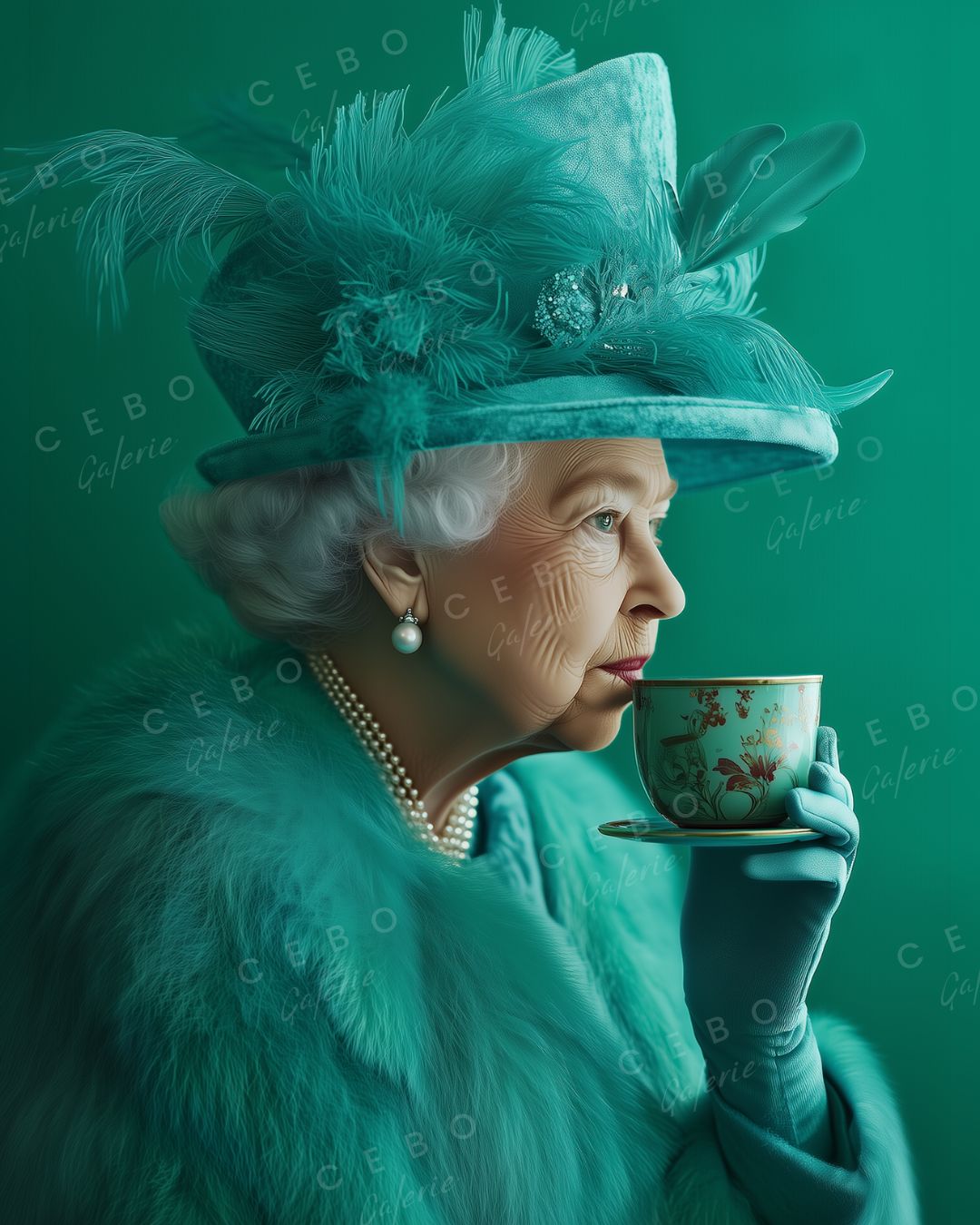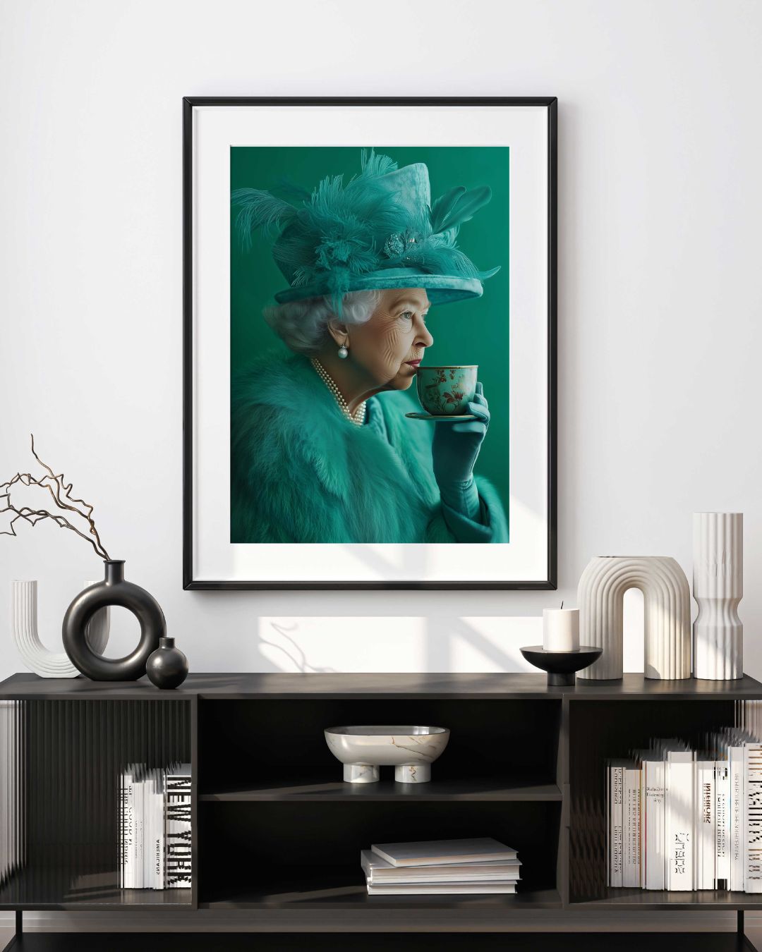 Cadre “Reine du Thé”, “Reine du Thé” est une affiche d’art encadrée au style conceptuel, sophistiqué et subtilement décalé. Le portrait met en scène une figure féminine royale, vêtue d’une luxueuse fourrure verte assortie à un chapeau sculptural orné de plumes. Sur un fond vert profond et harmonieux, elle tient délicatement une tasse de thé, symbole intemporel de raffinement et de tradition.
