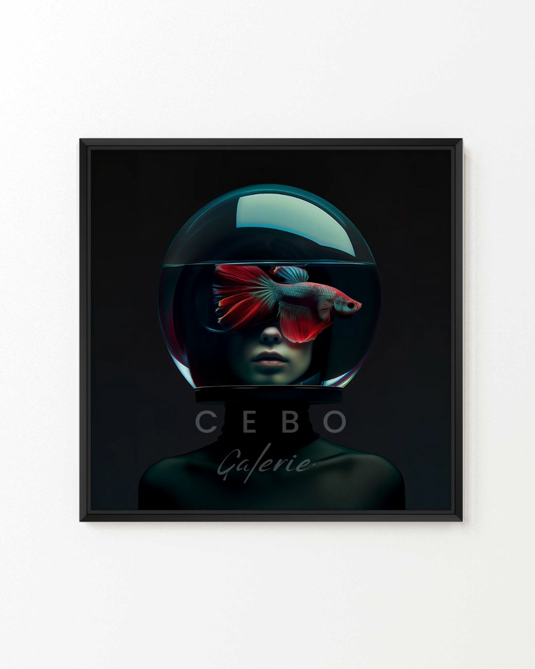 Tableau "Beauté Captive", une œuvre d’art unique et captivante, encadrée pour un effet galerie qui sublime votre décoration. Cette création conceptuelle et minimaliste met en lumière une femme portant un casque futuriste en forme d’aquarium, où un poisson combattant rouge semble nager avec grâce. Ce contraste saisissant entre la vibrance de l’animal et la sobriété de la tenue noire de la femme interpelle immédiatement, invitant à une réflexion profonde sur le lien complexe entre l’humain et la nature.