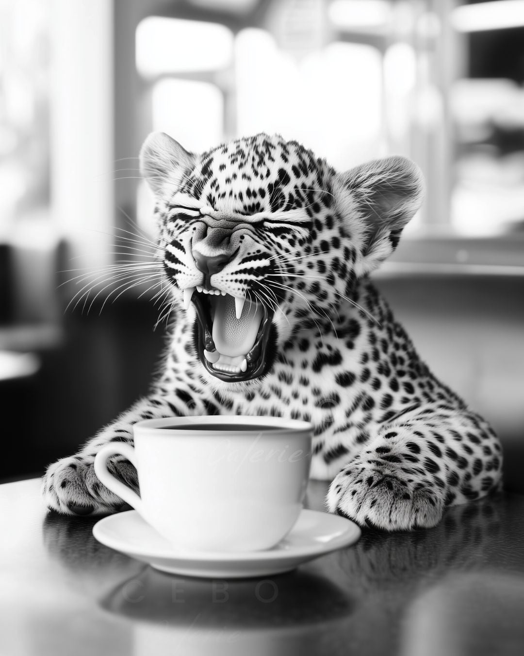 Tableau "Café Sauvage", une œuvre unique qui mêle humour visuel, raffinement graphique et clin d’œil à nos rituels matinaux. En noir et blanc éclatant, un jeune léopard, encore à moitié endormi, se tient attablé dans un diner rétro, face à une tasse de café fumant. L’image, aussi décalée que captivante, évoque à la fois la force brute de l’animal et la tendresse de nos matins grinçants.