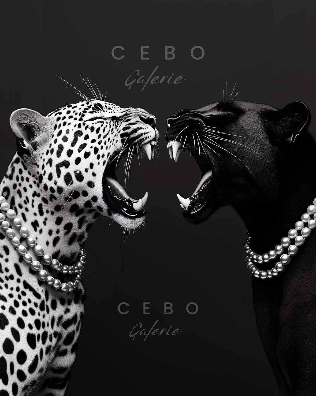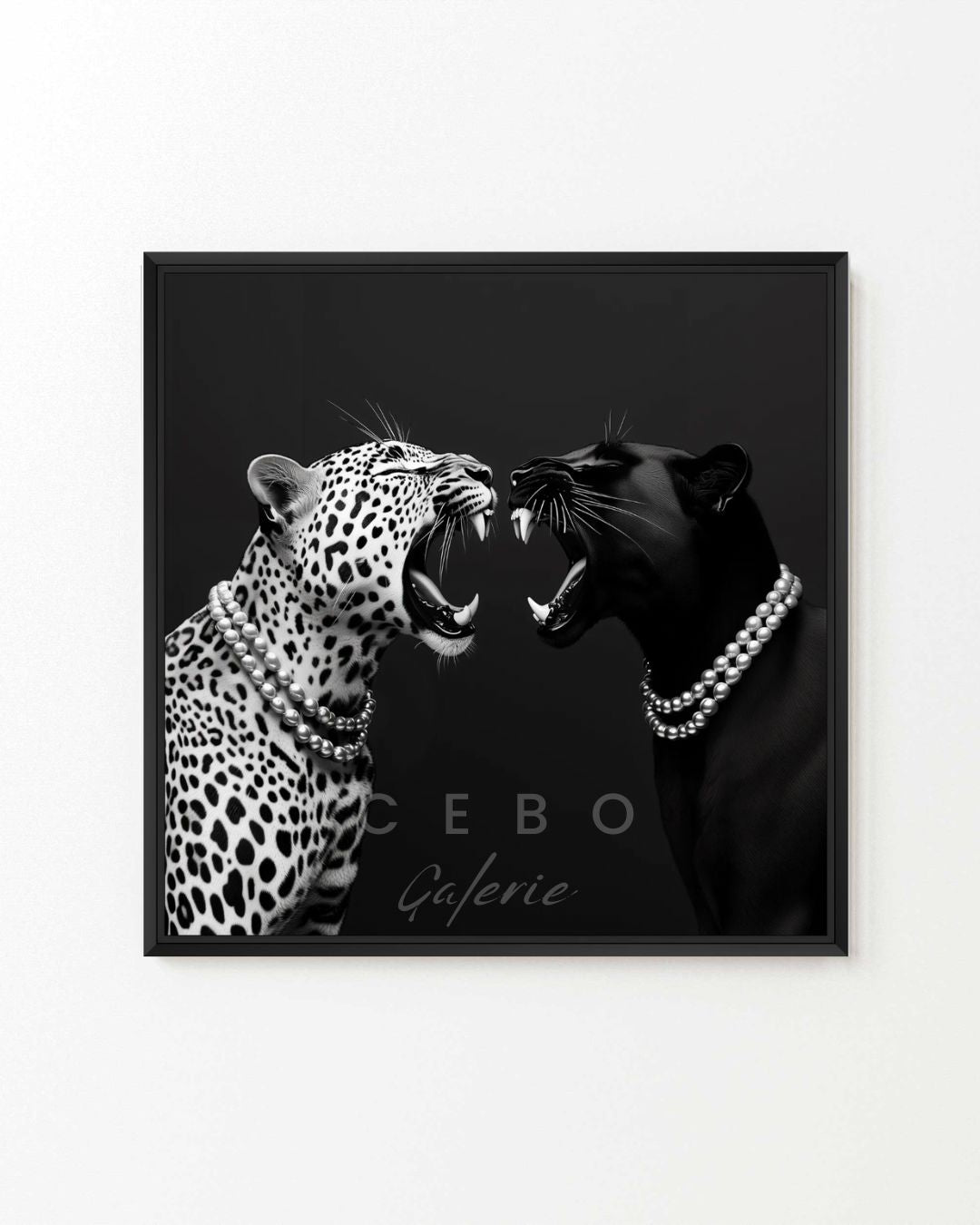 Tableau "Duel Sauvage", une œuvre d’art unique qui transcende les codes traditionnels. Imprimée sur plexiglas avec une précision exceptionnelle, cette création minimaliste en noir et blanc capture l’intensité d’un face-à-face entre une panthère noire et un jaguar, leurs gueules ouvertes dans un rugissement symbolique. Les colliers de perles qu’ils arborent ajoutent une touche inattendue de raffinement à cette scène sauvage, créant un contraste fascinant entre la force animale et l’élégance humaine.