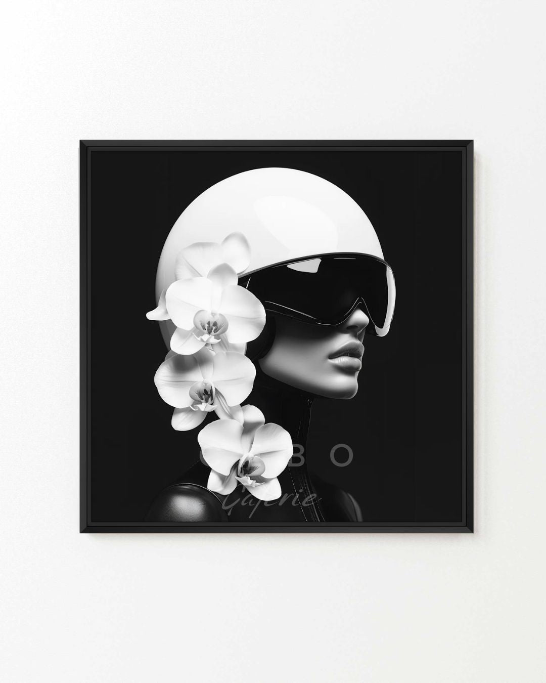 Tableau "Féminité Masculine", une œuvre d’art unique en son genre qui redéfinit les frontières entre force et délicatesse. Ce tableau conceptuel en noir et blanc met en scène une femme portant un casque de moto noir, associé à de fines orchidées blanches, symboles de grâce et de féminité. Sa combinaison en cuir et sa posture de profil évoquent un équilibre harmonieux entre des éléments traditionnellement perçus comme masculins et féminins, créant une composition visuellement captivante.