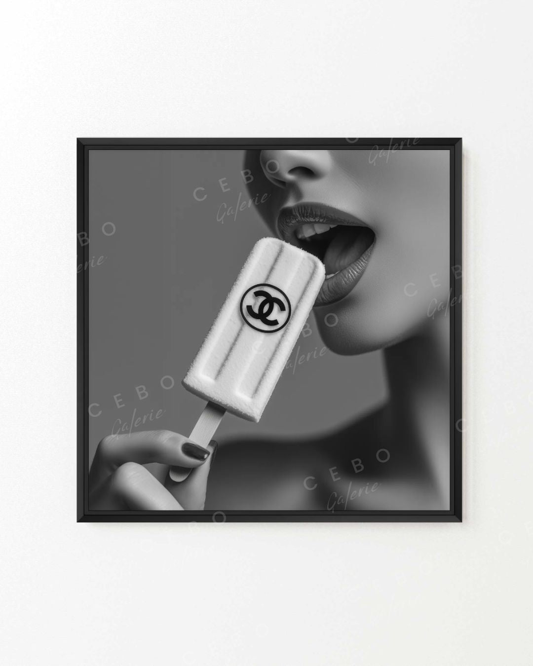 Tableau “Goût de Luxe”, Goût de Luxe est une ode à l’élégance détournée. Dans cette composition en noir et blanc aussi minimaliste que percutante, une femme chic porte à ses lèvres une glace popsicle… frappée du mythique logo Chanel. Une scène à la fois glamour, irrévérencieuse et délicieusement provocante, où la haute couture flirte avec la gourmandise.