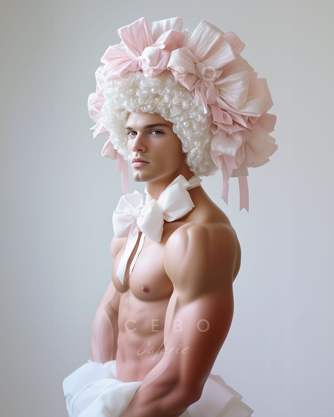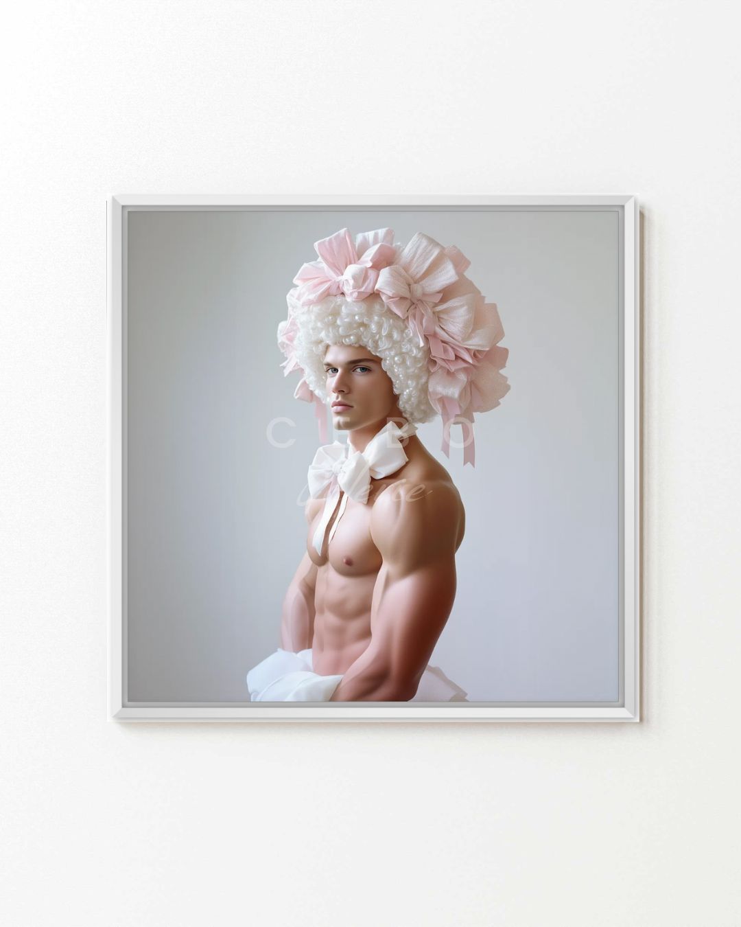Tableau "Le Favori de la Reine", une œuvre d’art captivante qui revisite l’élégance de la cour de Versailles à travers une interprétation contemporaine. Ce tableau unique, imprimé sur Plexiglas de haute qualité, présente un jeune courtisan torse nu, coiffé d’une majestueuse perruque blanche ornée de nœuds roses et blancs éclatants. Sur un fond gris clair, cette composition minimaliste célèbre la beauté classique tout en la mêlant à des codes modernes.