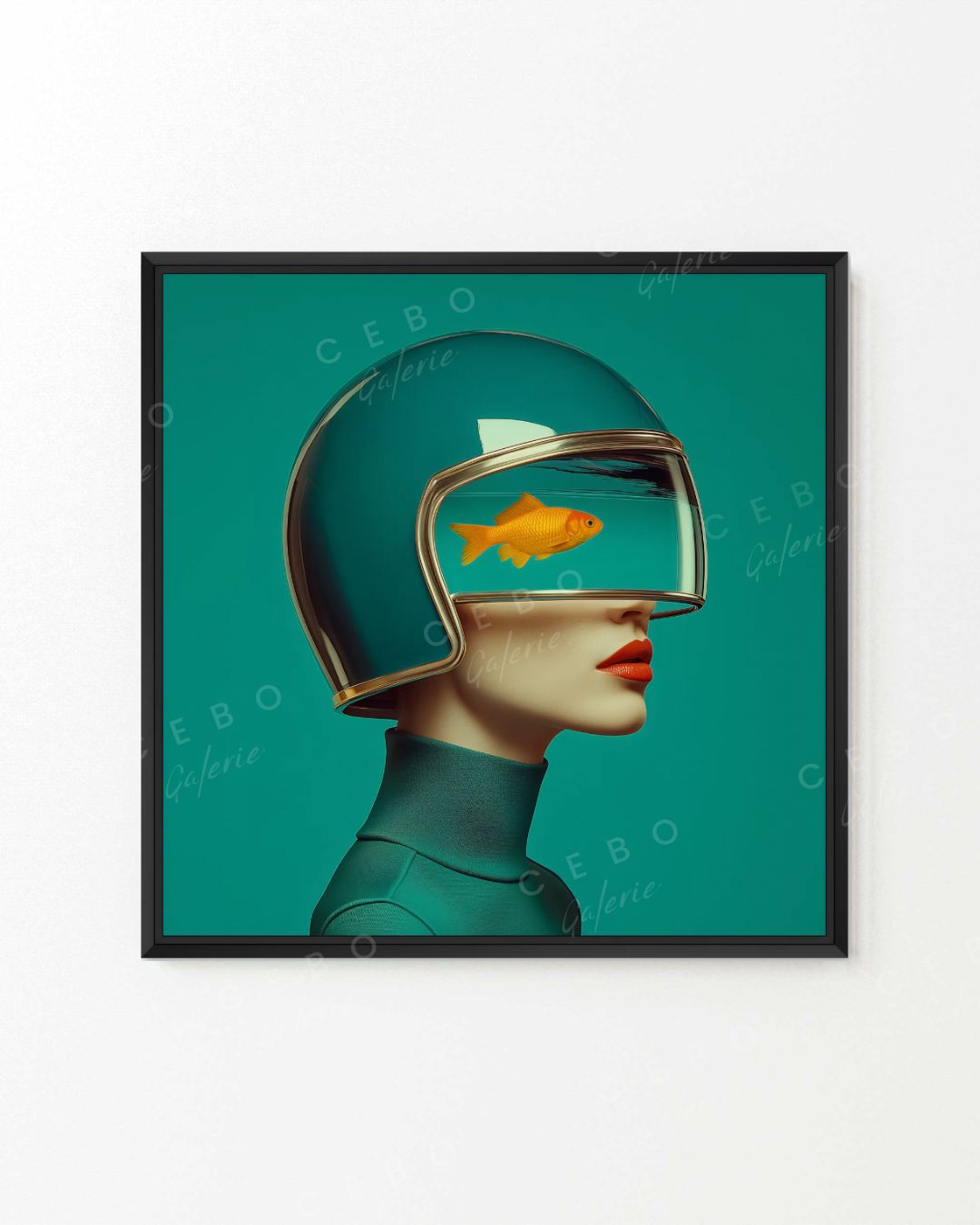 Tableau "Muse Aquatique", Muse Aquatique nous plonge dans un univers rétro-futuriste où l’élégance féminine se mêle à la poésie surréaliste. Cette œuvre intrigante représente une femme coiffée d’un casque en forme d’aquarium, dans lequel nage un poisson doré, suspendu dans le silence.