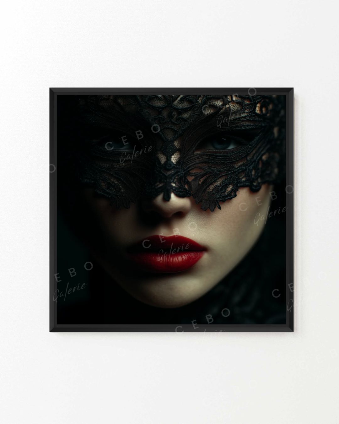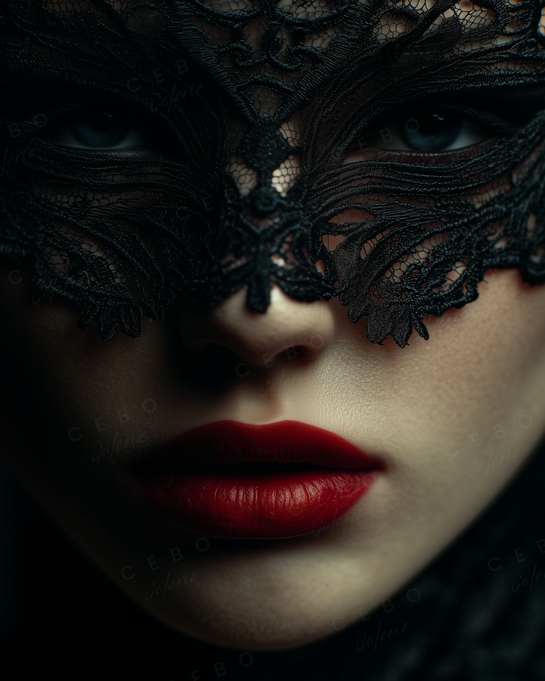 Son visage, à demi dissimulé sous une dentelle noire finement ouvragée, laisse transparaître des yeux mystérieux, profonds et indomptables. En contraste, ses lèvres rouge carmin — impeccables, vibrantes, presque irréelles — deviennent le cœur battant de cette composition dramatique.