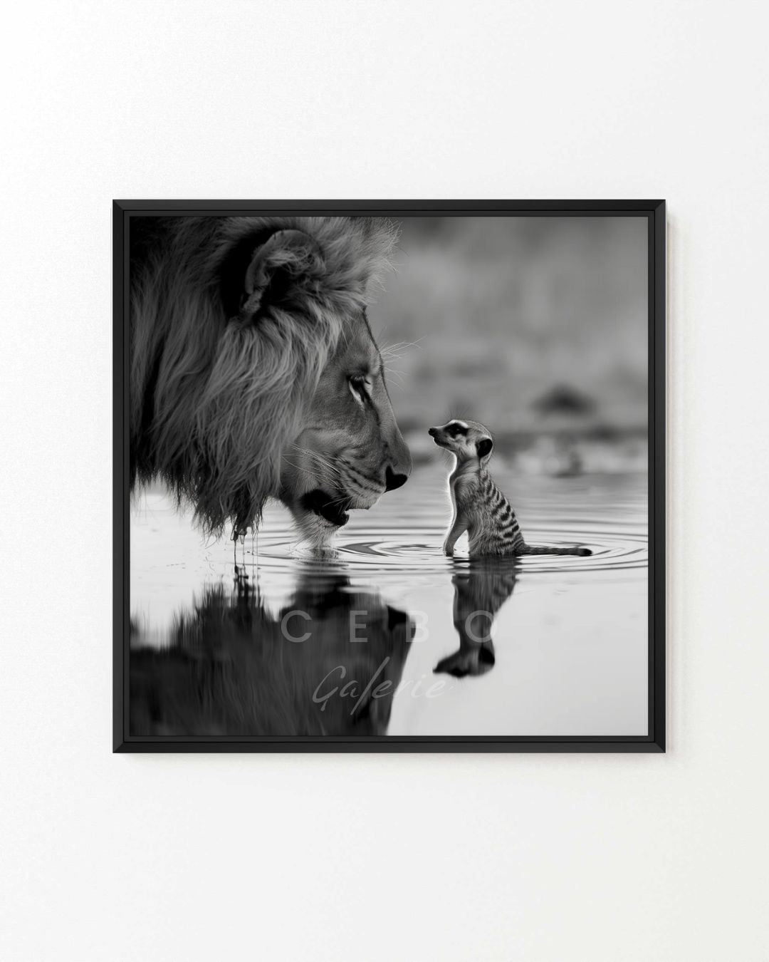 Tableau "Rencontre Sauvage", une œuvre unique et puissante qui célèbre la beauté brute et les contrastes de la nature africaine. En noir et blanc, cette scène inoubliable capture l’instant suspendu où un majestueux lion et un frêle suricate se font face, immergés dans l’eau calme d’un étang. Le face-à-face, à la fois tendre et saisissant, évoque un dialogue muet entre puissance et fragilité, entre respect et curiosité.