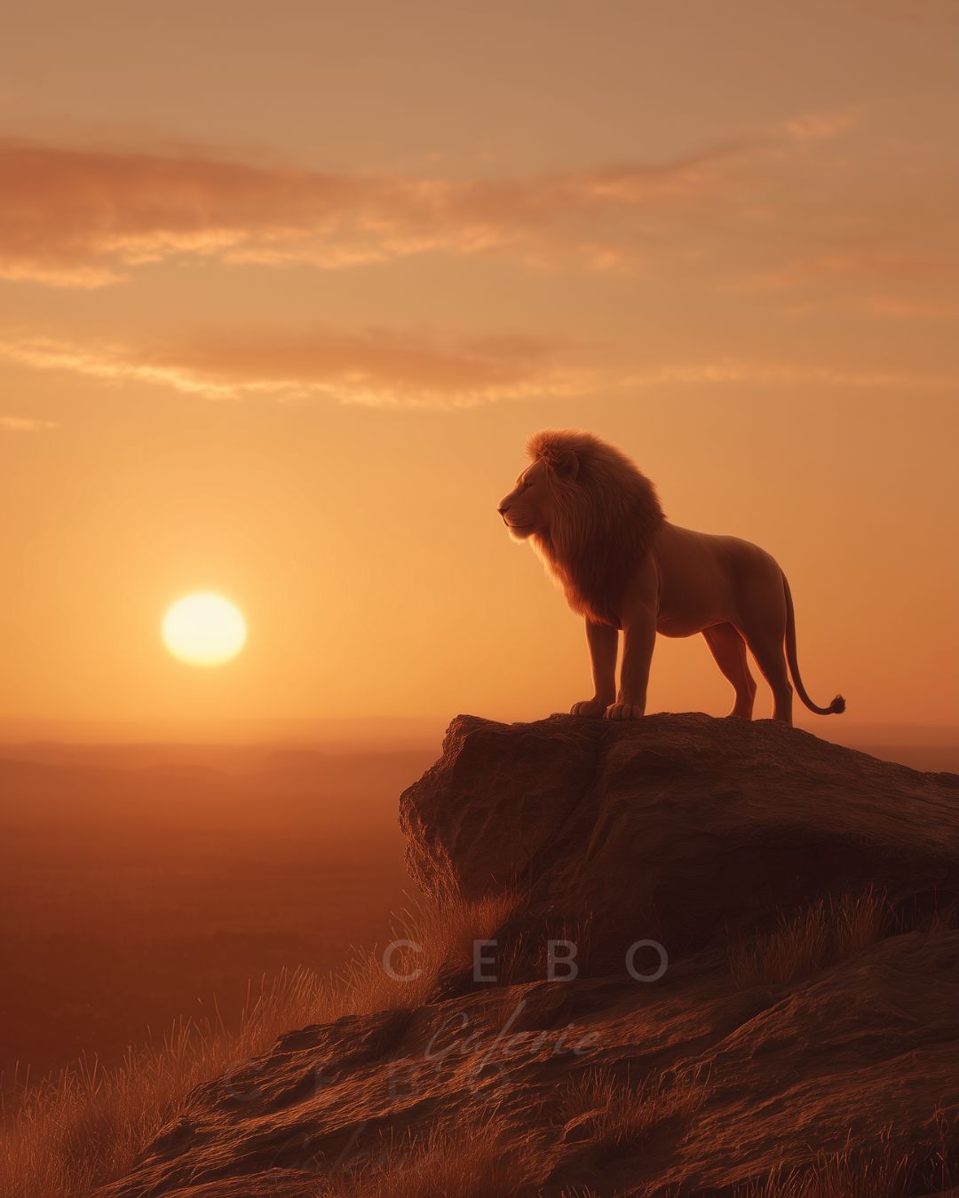 Tableau "Roi Soleil", une œuvre unique et majestueuse qui célèbre la puissance tranquille du roi de la savane. Un lion, campé sur un promontoire rocheux, surplombe une savane embrasée par les derniers rayons du soleil couchant. La lumière dorée enveloppe sa silhouette imposante, sculptant les contours de son pelage avec une intensité presque mystique. Chaque détail, chaque ombre, chaque éclat renforce la sensation d’équilibre entre puissance brute et calme souverain.