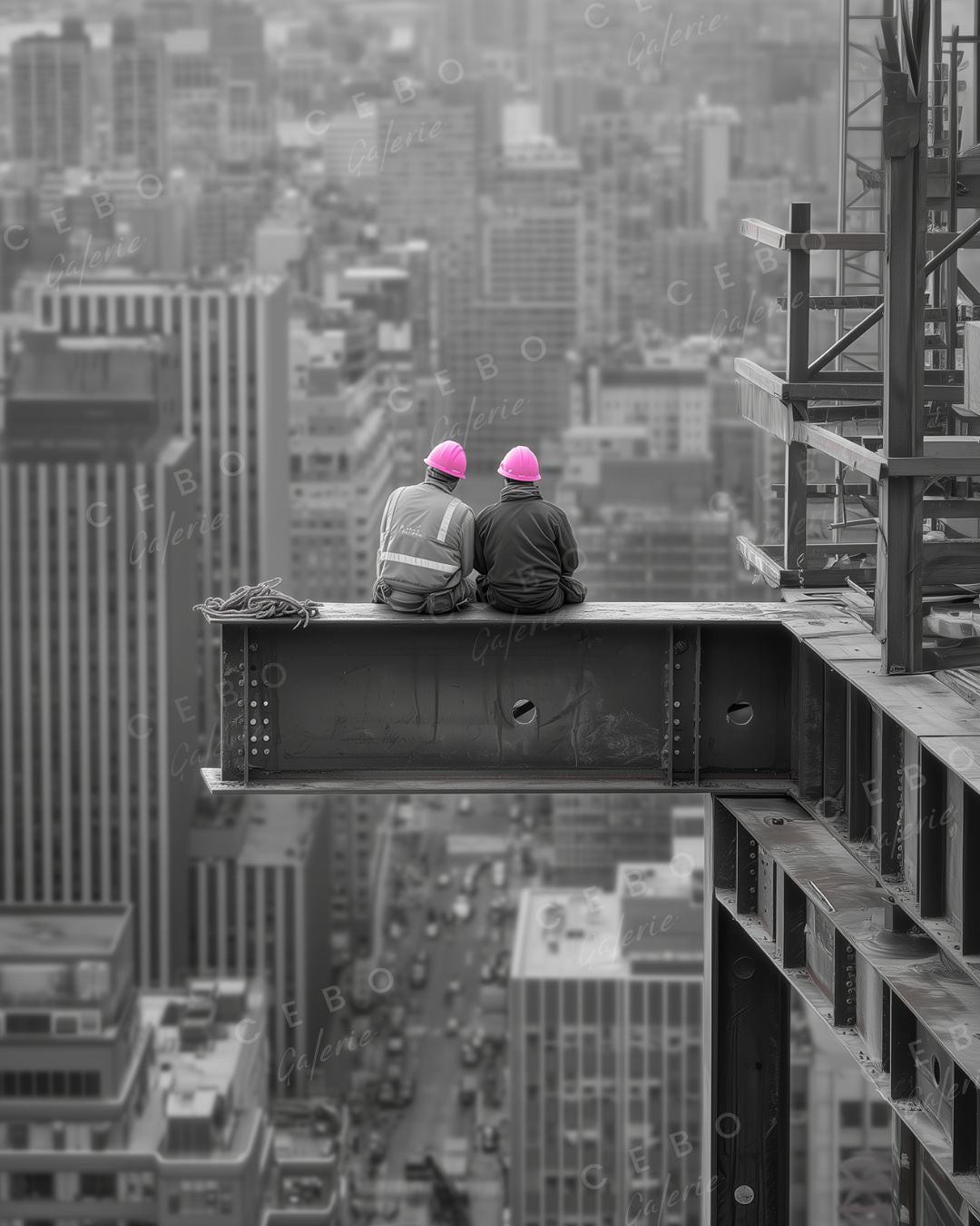 Le noir et blanc met en valeur la structure d’acier, l’architecture imposante, et la verticalité vertigineuse de la ville. Mais ce sont les casques rose vif qui attirent l’œil, injectant une note de modernité et de douceur dans un univers d’ordinaire brutal. Symbole de solidarité, de différence assumée ou de regard nouveau sur la masculinité, ce détail colore toute la lecture de l’œuvre.