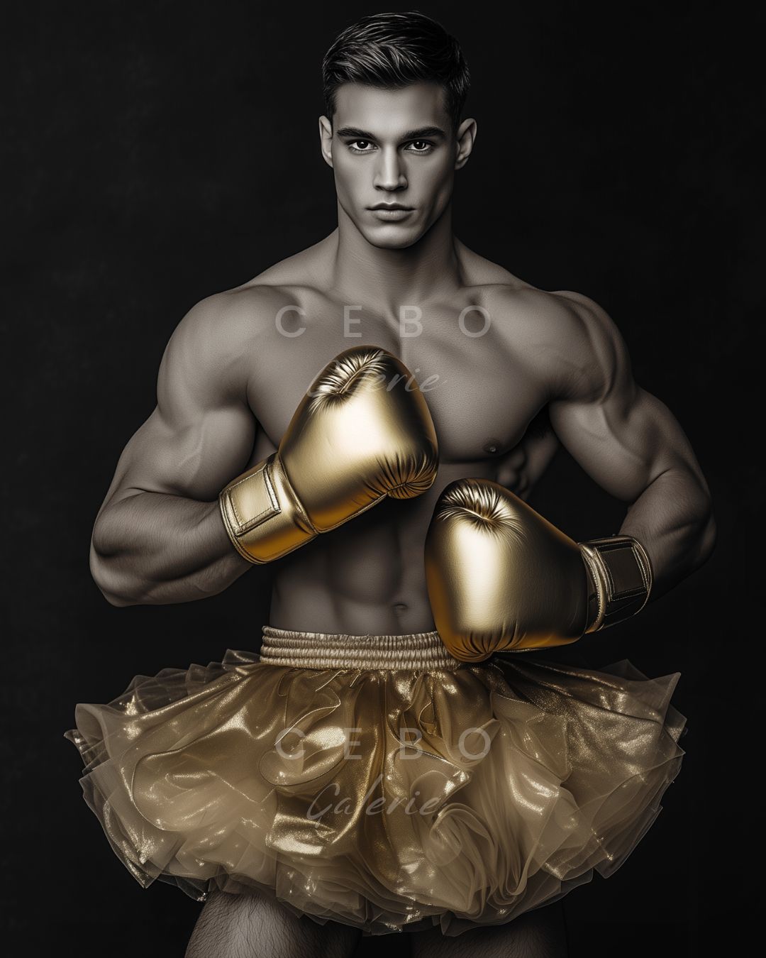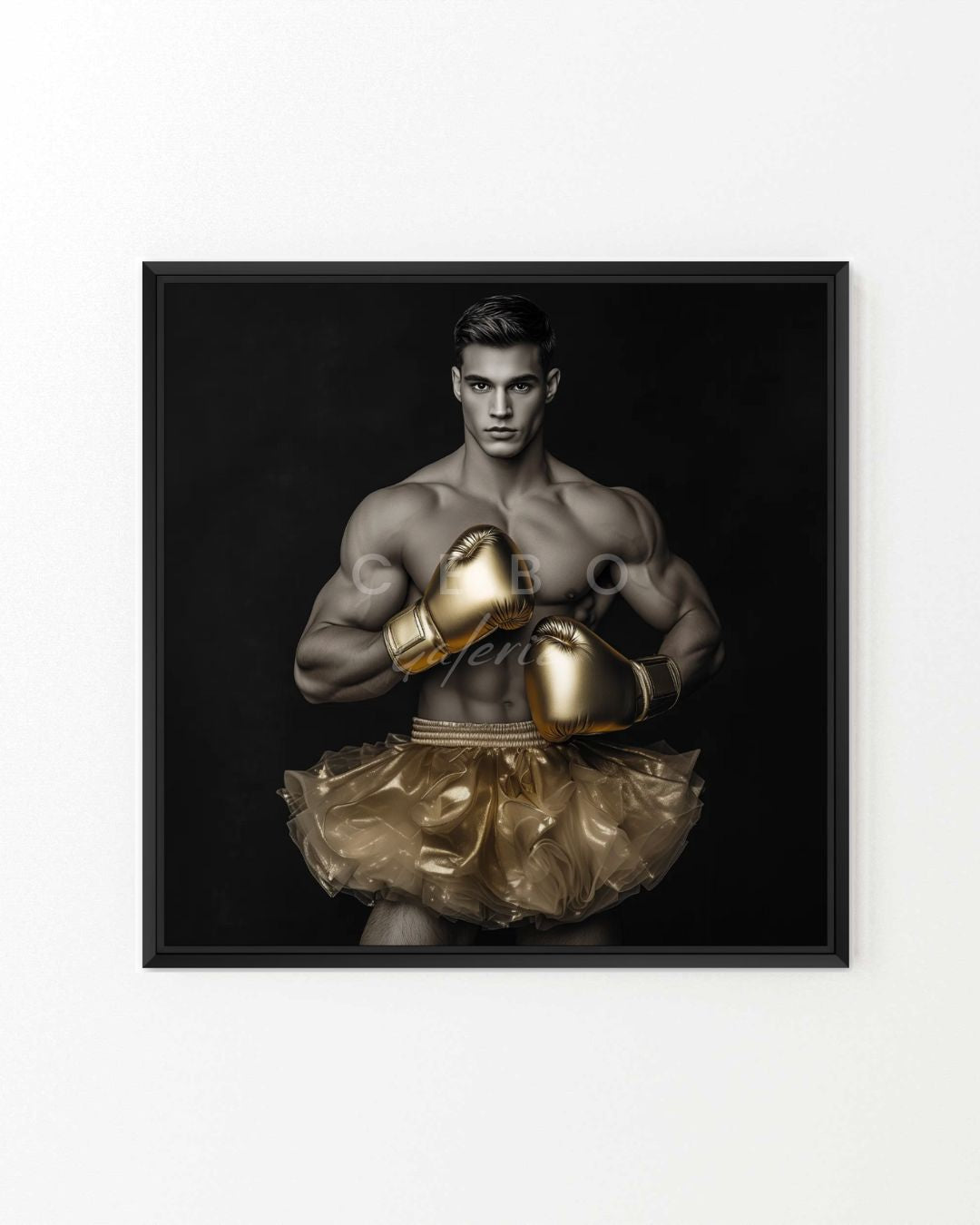 Tableau 'Virilité Dorée', une œuvre d’art exclusive qui transcende les frontières de la force et de la délicatesse, disponible sous forme de tableau unique imprimé sur Plexiglas. Ce tableau captivant représente un jeune homme puissant, paré d’un tutu de ballet et de gants de boxe, tous deux dans une teinte dorée somptueuse. Le choix du doré symbolise l’éclat et le prestige, tout en ajoutant une dimension élégante à des éléments traditionnellement associés à la masculinité.